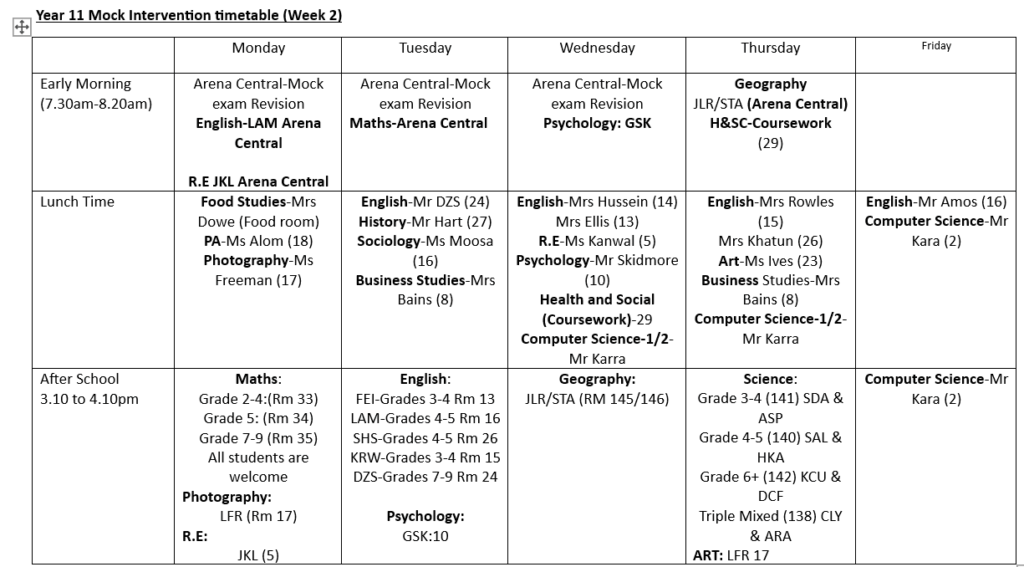 YEAR 11 MOCK EXAM TIMETABLE OCTOBER 2025