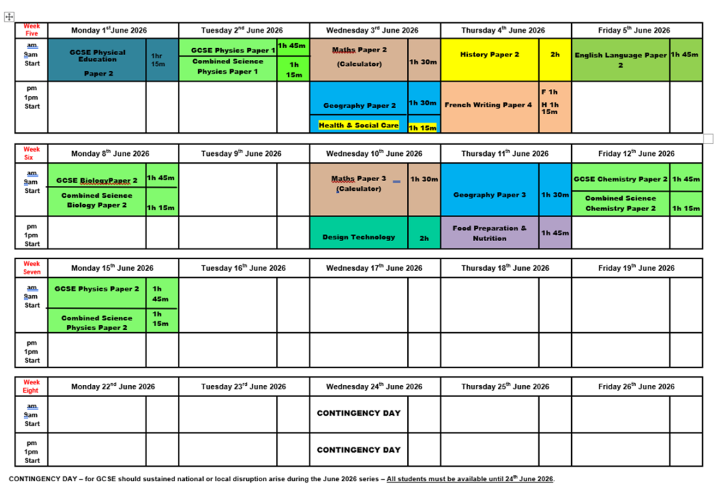 YEAR 11 Summer 2026 Examination Timetable